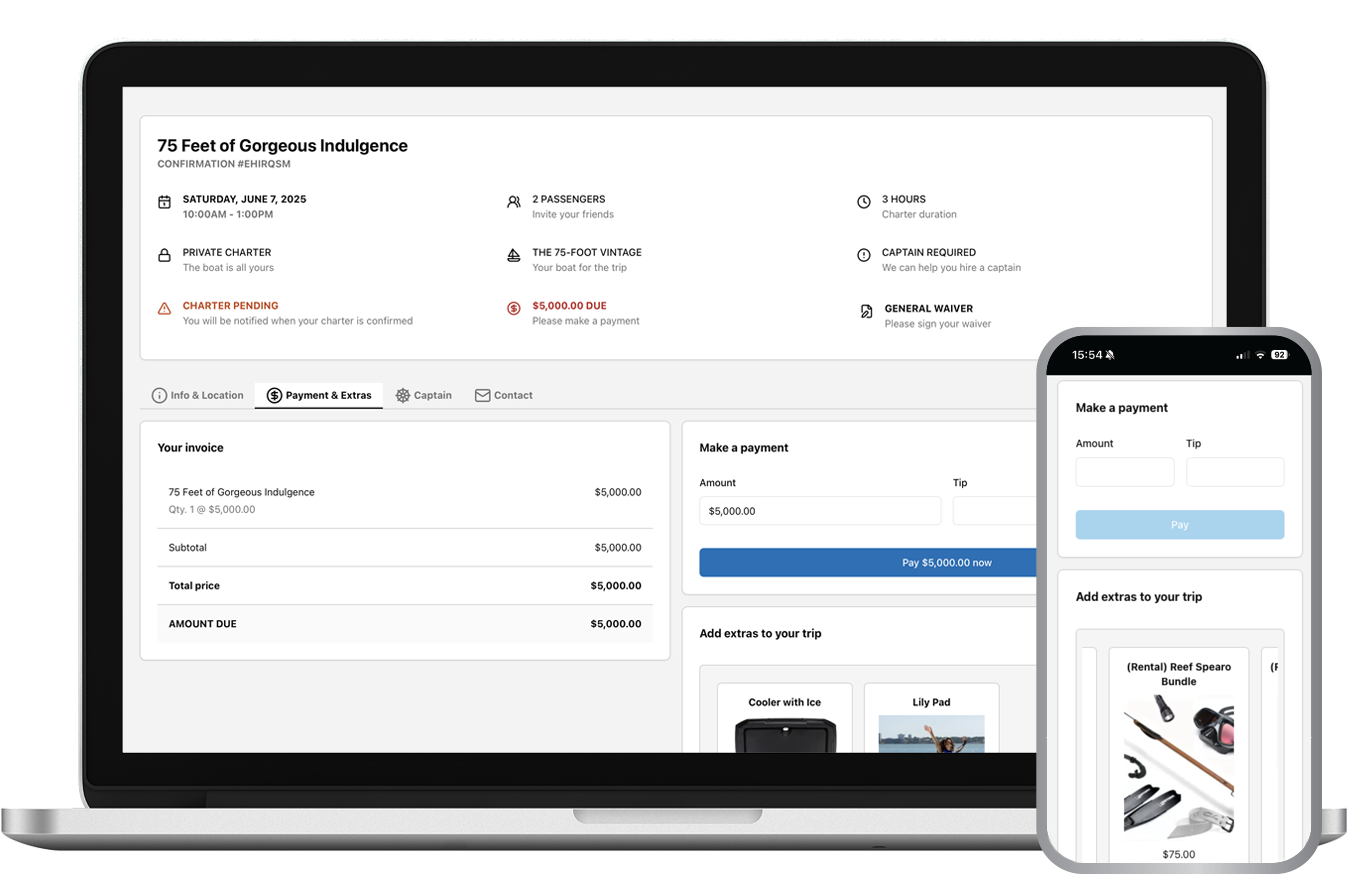Each of your customers will have access to a powerful booking management page where they can view trip instructions, purchase add-ons, hire a captain, and make payments.