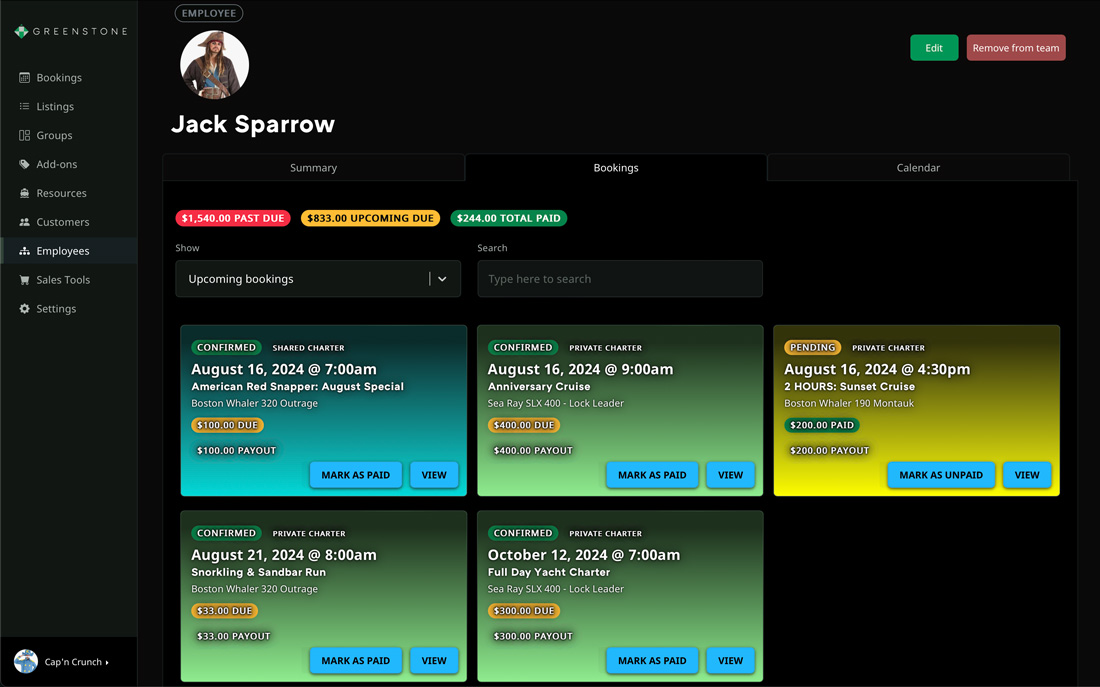 Build your team of captains and crew and give them the platform access they need with simple permission options. Easily assign employees to trips, set their payouts, and keep them informed with automated emails and text messages.