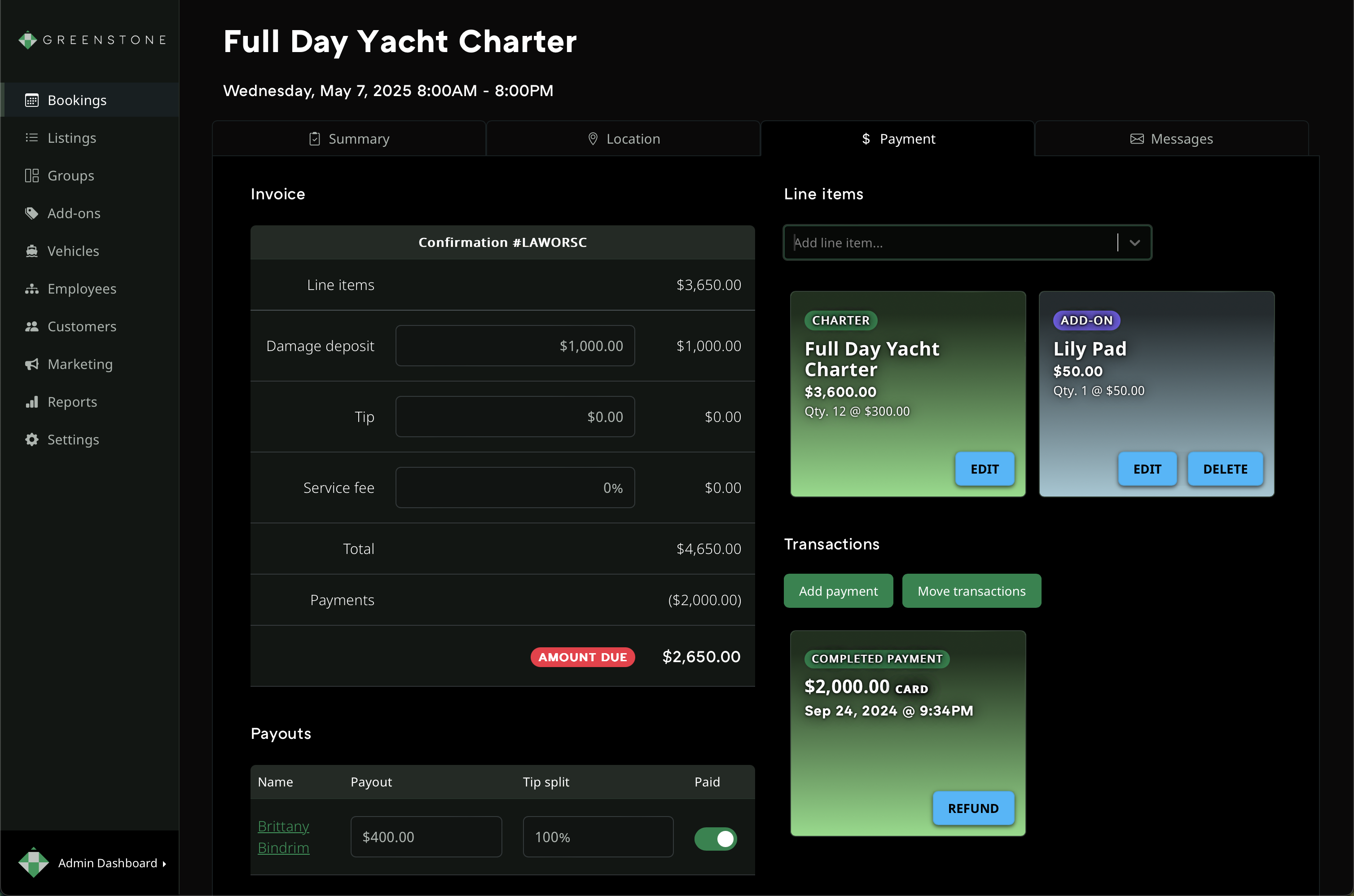 Keep a close eye on balances and payment statuses of your bookings. Track invoices, add line items, apply discounts, add tips, and view payment histories.